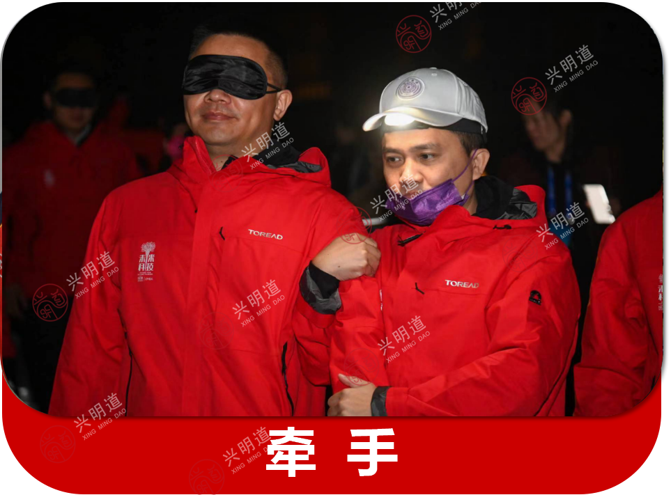 参与者每两人一组,一个戴上眼罩,另一个被要求不能发出声音,两人携手穿越一系列障碍到达目的地。